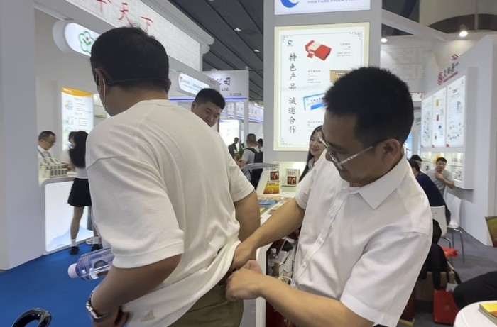 展会现场,富兴飞鸽药业主推的黄金单品“代温灸膏”吸引了大批参展观众驻足体验。该产品融合传统灸法与现代透皮技术,以“温经通络、散寒镇痛”的功效,成为中医特色灸疗领域的热门之选。此外,特色产品矩阵同样表现亮眼:气血肾不虚的“三胶颗粒”、增强免疫的“参林健体粉”、呵护胃肠的“胃疡灵颗粒”以及女性调经佳品“红枣当归颗粒”,凭借精准的定位与显著疗效,赢得众多经销商咨询洽谈。